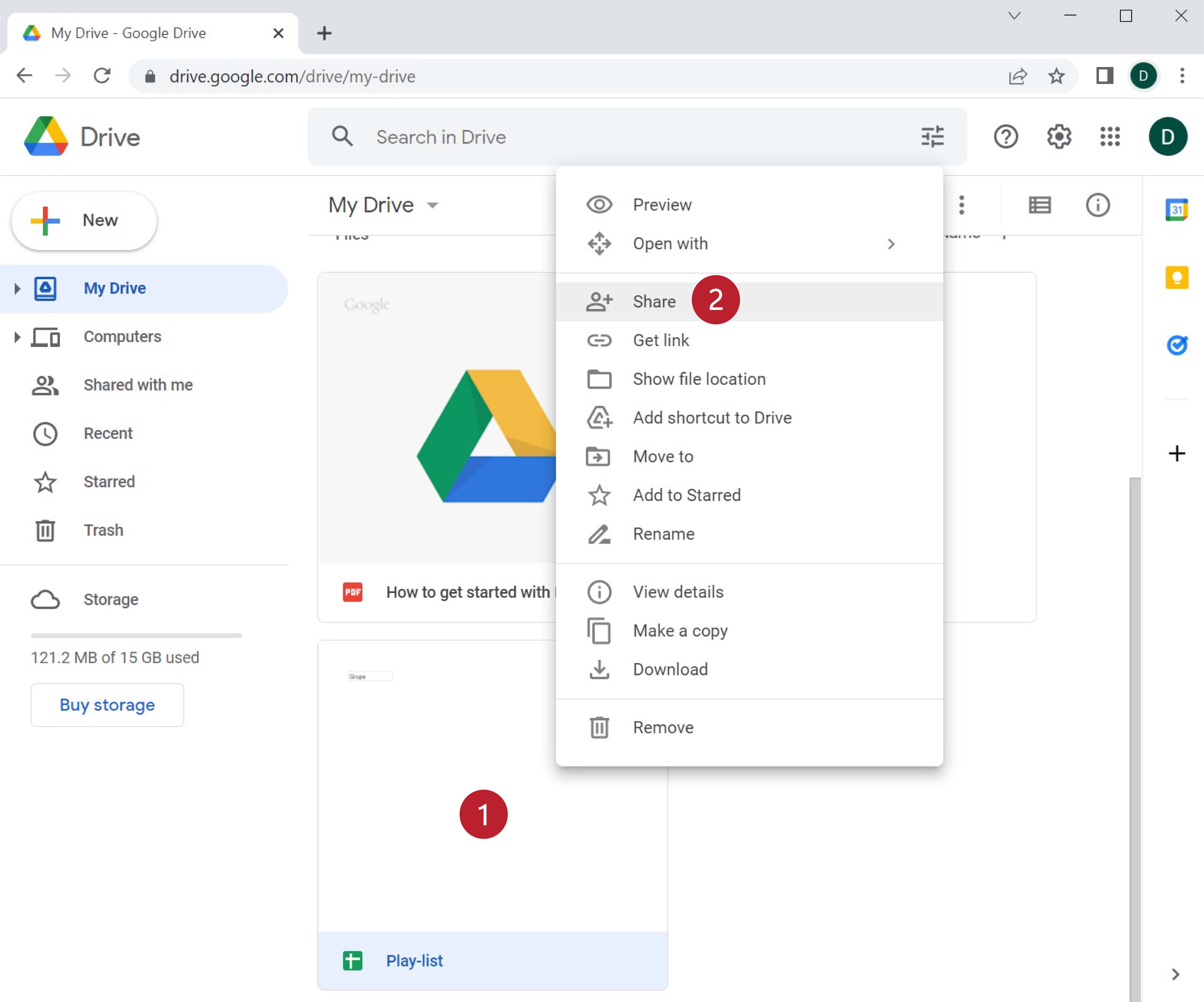 Сада ћемо поделити документ са другим корисницима. Кликни десним тастером миша на документ (1) и из менија који се појавио одабери „Share“ (2):