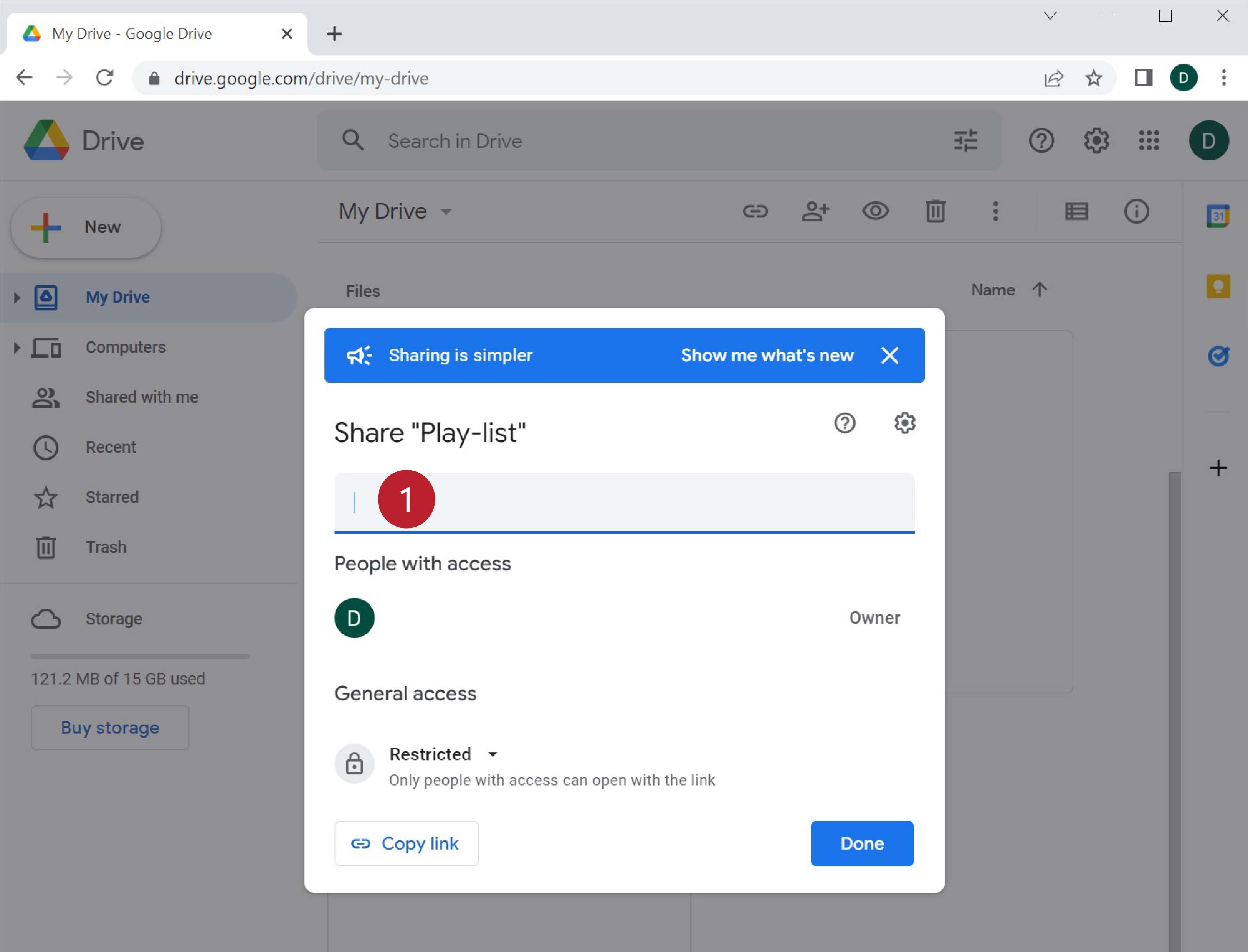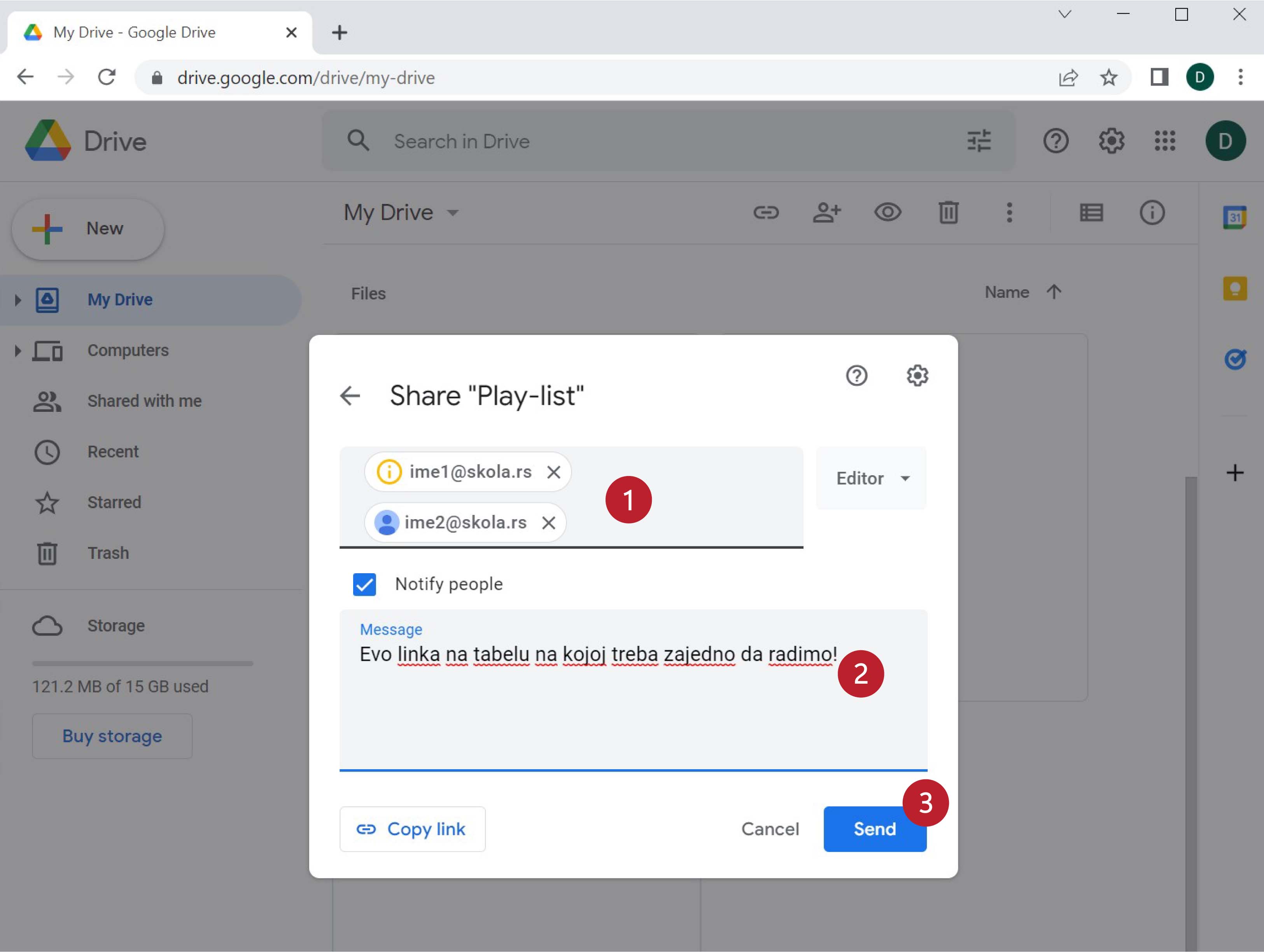 Појавиће дијалог помоћу кога ћемо поделити документ са друговима. У правоугаоник (1) унеси имејл адресе другова са којима ће табела бити подељена.