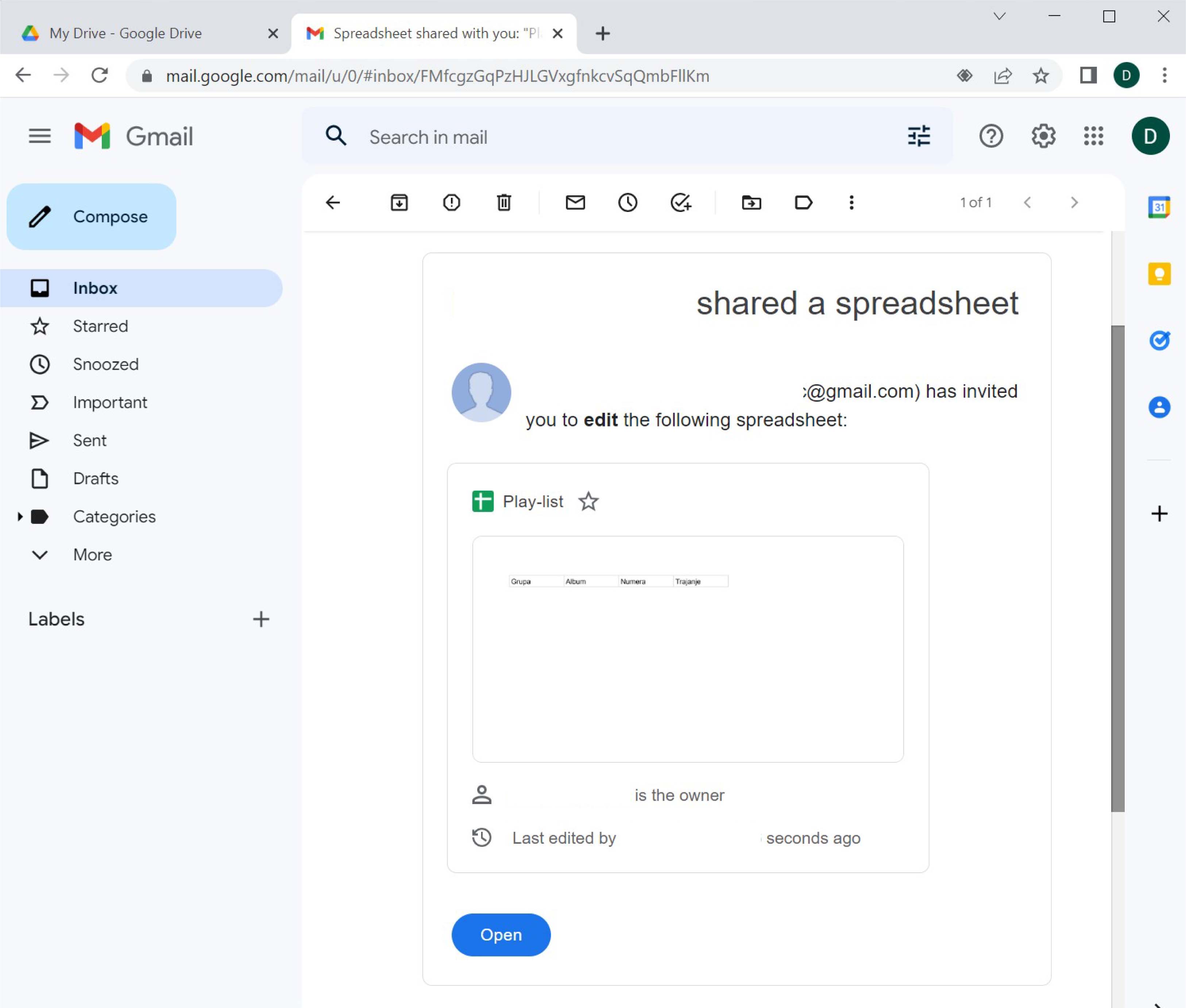 Сачувај поруку са обавештењем да је документ подељен са тобом јер у сваком тренутку можеш доћи до документа тако што ћеш отворити поруку и кликнути на „Open“.