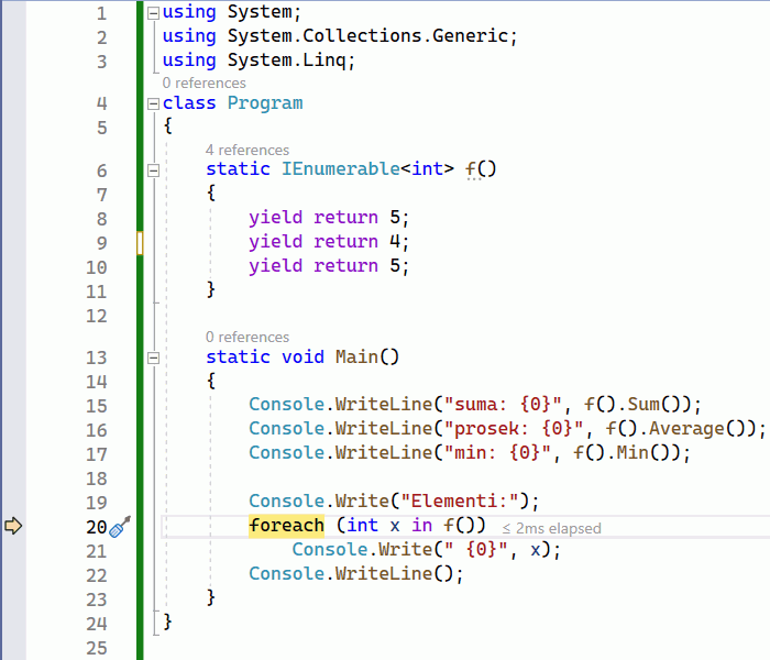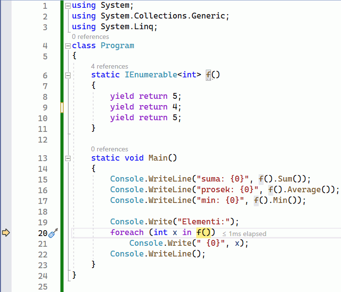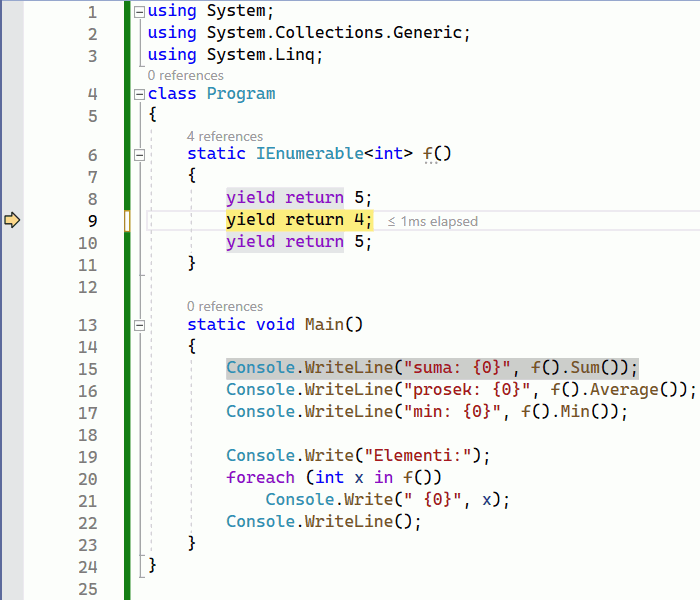Linqметода, методf()се извршава од почетка до краја, тј. пролази се кроз све елементе колекције коју он генерише, односно кроз све његовеyield returnнаредбе.На крају, при извршавању наредбе