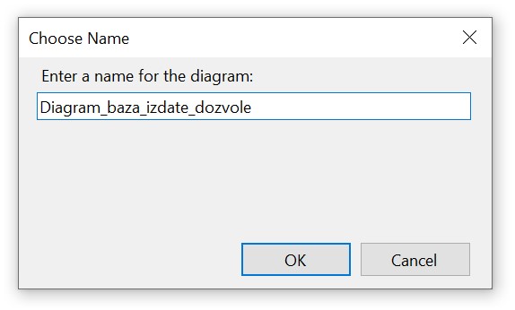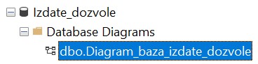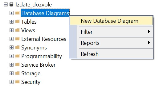 Након што је креирана комплетна база података, можемо да креирамо њен дијаграм. Кликнути десни тастер миша над Database Diagrams под базом података за евиденцију издатих возачких дозвола и изабрати New Database Diagram.