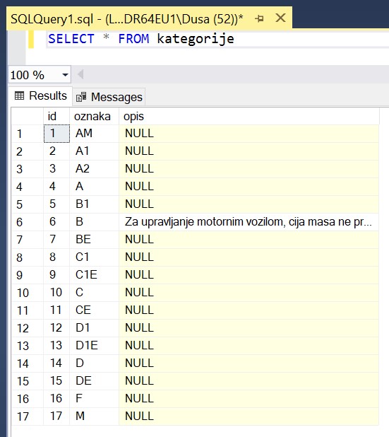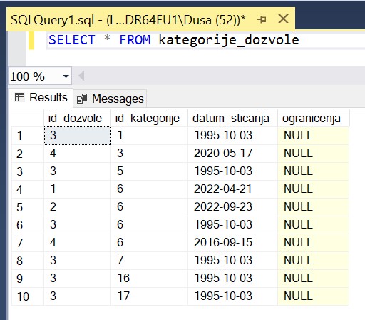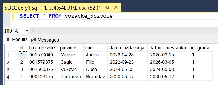 Покретањем једноставних упита можемо да видимо како изгледају попуњене табеле.
