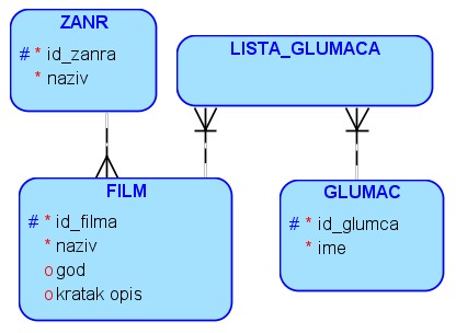 На следећој слици је приказан модел базе података у којој чувамо основне податке о филмовима, жанровима и глумцима. Ради једноставности базе података, име и презиме глумца чувамо у једном пољу. Иако је могуће да два глумца имају исто име и презиме, глумци често узимају уметничка имена, баш да би били јединствени, па ћемо из тог разлога у задацима сматрати да је врло вероватно да је име глумца јединствено. Исто тако ћемо у задацима претпоставити да је име филма врло вероватно јединствено. Ово нећемо поставити као ограничења приликом креирања табела управо из разлога што, изузетно ретко, може да се догоди да се два филма зову исто, као и да два глумца имају исто име и презиме.