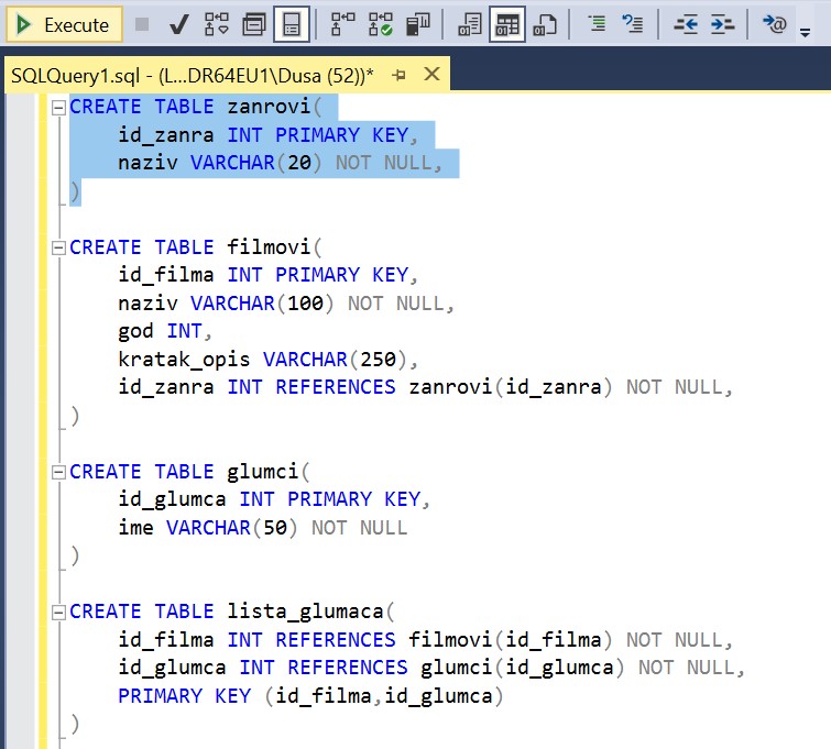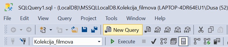 Уколико је прозор за писање команди угашен, кликнути поново дугме New Query испод главног падајућег менија. Све команде могу да се истовремено прекопирају, али се свака појединачно прво означи мишем и за сваку означену команду се кликне Execute.