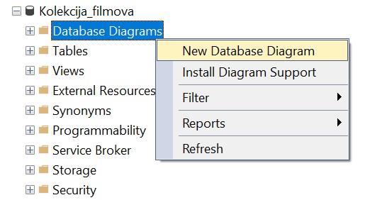 Након што је креирана комплетна база података, можемо да креирамо њен дијаграм. Кликнути десни тастер миша над Database Diagrams под базом података за колекцију филмова, и изабрати New Database Diagram.