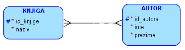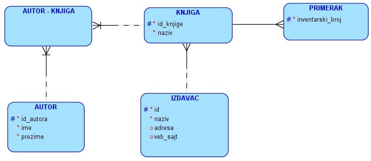 Напомена: Овај модел је исправан уколико се узме у обзир претпоставка да библиотека чува уџбенике. Уколико се у библиотеци налазе само романи, онда је веза ентитета AUTOR и KNJIGA могла да буде један-према-више (роман има тачно једног аутора).