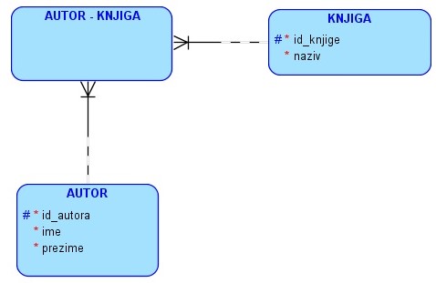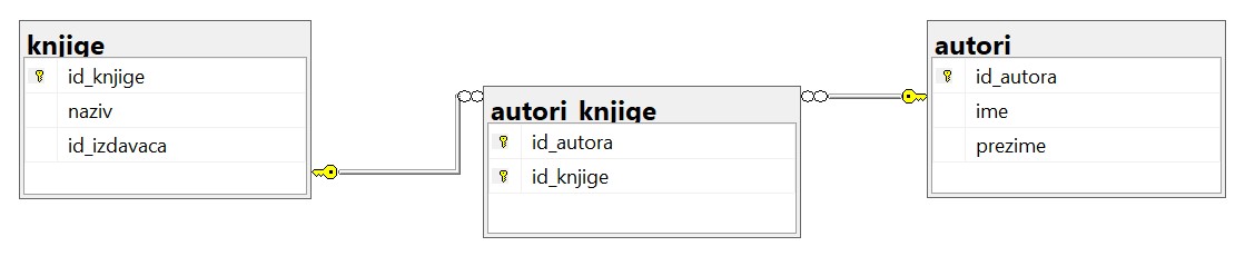 Описани део модела се у релационој бази приказује како је илустровано на следећој слици. Сетимо се да књига има издавача, па се у табели knjige налази и страни кључ id_izdavaca.
