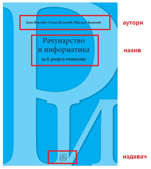 Погледајмо поново корице следеће књиге. На тим корицама видимо назив књиге, као и основне податке о ауторима и издавачу. Већ смо видели како се унесе подаци о овој књизи и издавачу у релациону базу података. Сада је потребно да додамо ауторе и да повежемо ауторе са књигом.