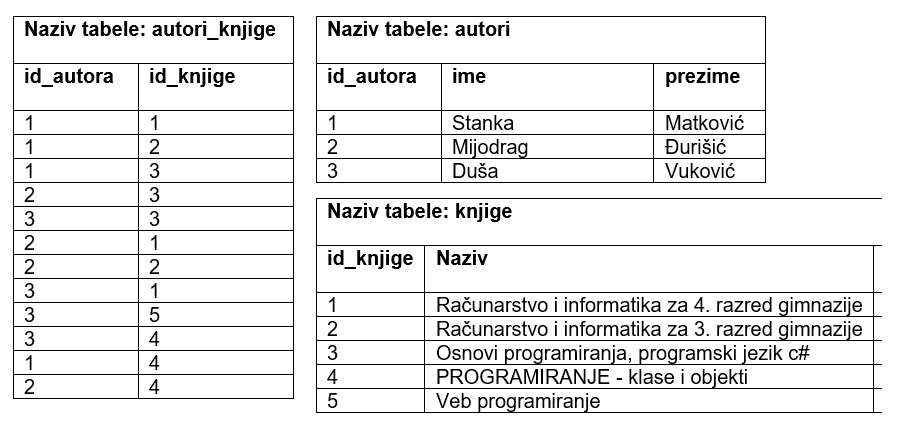 Како књига има три аутора, потребно је додати три реда у табелу autori_knjige, сваки ред представља једну комбинацију аутора и књиге.