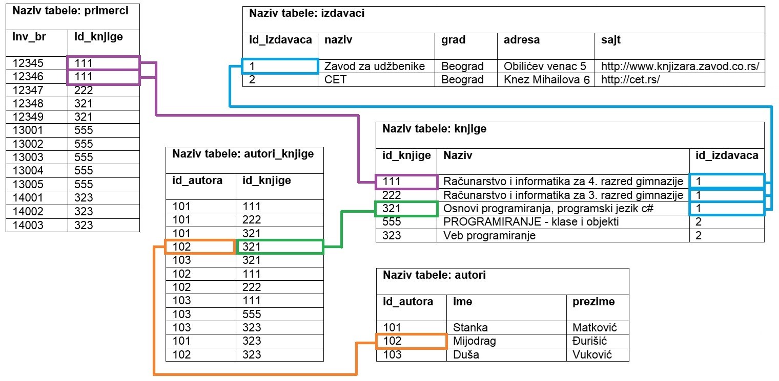 На слици су различитим бојама означени неки примери веза међу подацима који се налазе у различитим табелама да би се илустровало како то повезивање функционише. Плавом бојом су обележене три књиге истог издавача са идентификационим бројем 1. Љубичастом бојом су приказана два примерка књиге са идентификационим бројем 111. А зеленом и наранџастом је обележено како је у бази сачуван податак о томе да је Мијодраг Ђуришић један од аутора књиге „Основи програмирања, програмски језик с#“.