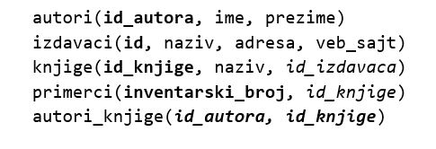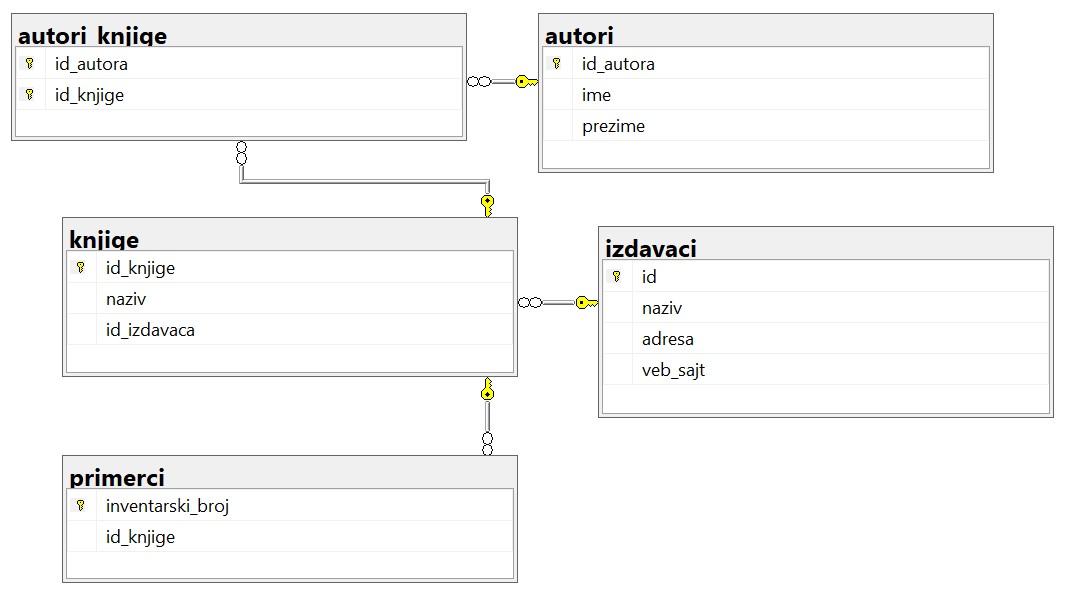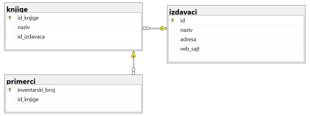 Када спајамо три табеле, спојимо две па онда вршимо спајање са трећом табелом. Након што повежемо примерке и књиге, на исти начин за књигу треба да у табели izdavaci погледамо ко је њен издавач.