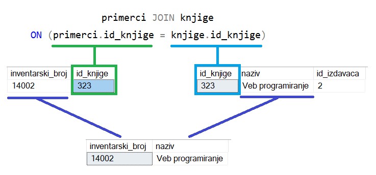 У делу FROM упита је потребно ове табеле спојити по вредностима комбинација: страни кључ и одговарајући примарни кључ, тј. примарни кључ на који страни кључ показује. За идентификациони број књиге једног примерка треба у табели knjige да пронађемо која је то књига.