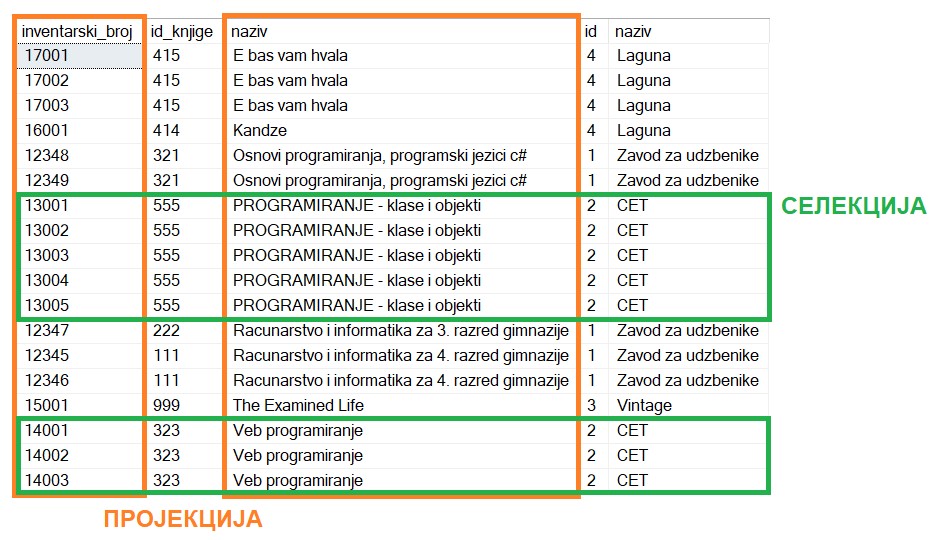 Задатак: Написати упит којим се приказују инвентарски бројеви и назив књига издавача чији је назив CET. Изменити заглавља колона у приказу резултата тако да буду редом „Primerak“ и „Naziv knjige“.