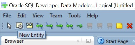 Креираћемо један по један ентитет. Можемо да почнемо од јаких ентитета. Нови ентитет додајемо помоћу дугмета New Entity, друго дугме са лева испод менија.