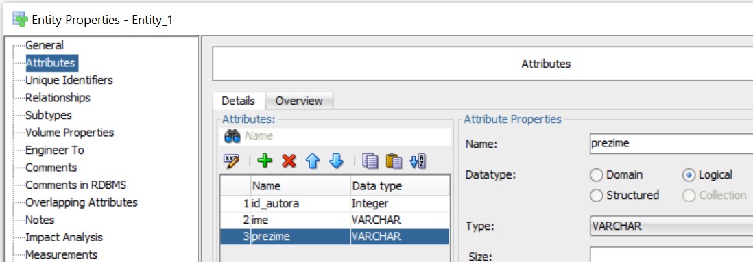 Када се на површину за цртање постави нови ентитет, појављује се дијалог у који можемо да унесемо назив ентитета и списак атрибута. Прво уносимо назив ентитета – Name.