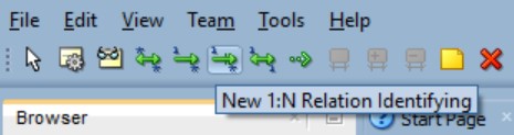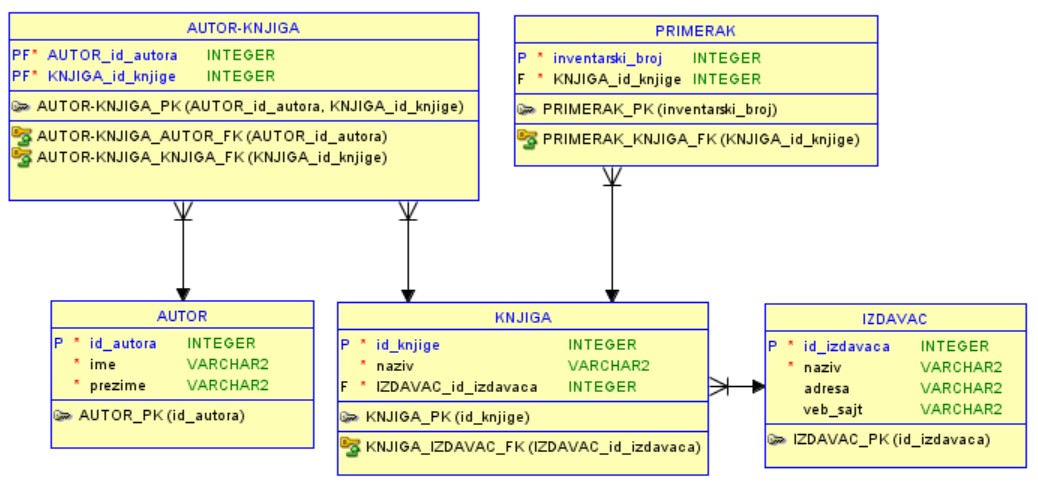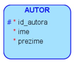 Ентитети AUTOR и AUTOR-KNJIGA, као и ентитети KNJIGA и AUTOR-KNJIGA су повезани везама један-према-више, које учествују као део примарног кључа табеле која ће одговарати ентитету AUTOR-KNJIGA, па се додају тако што се изабере New 1:N Relation Identifying.