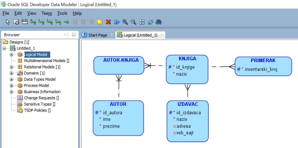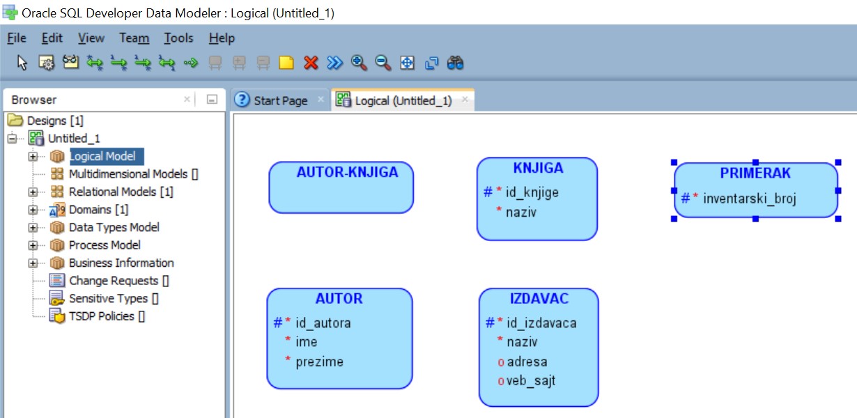 Помоћу алата за пројектовање Oracle Data Modeler ћемо креирати логички модел за део базе података за библиотеку у којем се складиште подаци о свим примерцима књига које се налазе у библиотеци.