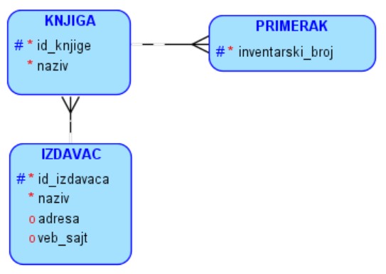 Када су додати сви ентитети, потребно је да их повежемо. Веза један-према-више се додаје тако што се изабере New 1:N Relation, једна од зелених стрелица испод менија, онда се прво кликне на ентитет који је на страни „један“, а затим на ентитет који је на страни „више“. На пример, прво се кликне на ентитет IZDAVAC, па онда на ентитет KNJIGA, зато што је један издавач објавио више књига. Понови се исти поступак и за ентитете KNJIGA и PRIMERAK. Од исте књиге имамо више примерака у библиотеци.