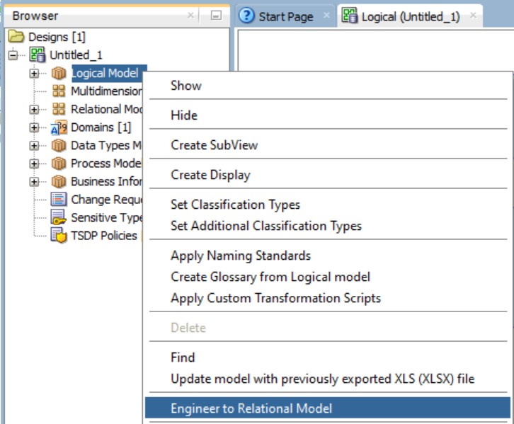 Можемо једноставно да добијемо релациони модел који подразумева дизајн табела као припрему за креирање релационе базе података, са списком свих колона, типова података и ограничења, укључујући стране кључеве, на следећи начин: прво је потребно кликнути тастер миша над ставком Logical Model и изабрати Engineer to Relational Model, а након тога кликнути на дугме Engineer.