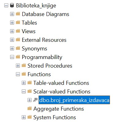 Креираћемо функцију коју можемо да употребимо у ситуацији када библиотека жели да провери колико има примерака књига неког издавача. Централни део програма је управо упит којим се приказује број примерака књига. Погледаћемо како изгледа овај упит за једног конкретног издавача.