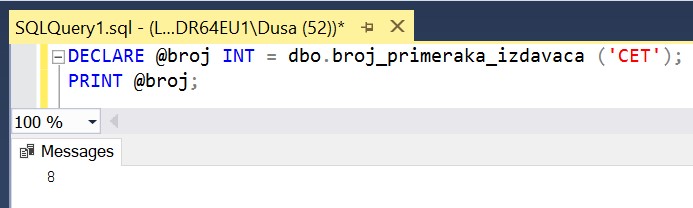 PRINT ' Broj primeraka: ' + CAST(dbo.broj_primeraka_izdavaca(@naziv) AS VARCHAR(10));