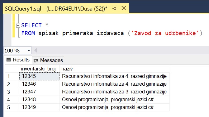 Након што се покрене овај програмски код, функција остаје сачувана у систему. Функцију која враћа табелу можемо да употребимо у упиту SELECT.