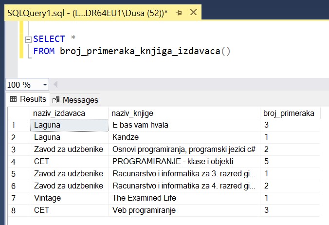 Резултат овог упита може да се види на следећој слици. Иако ова функција нема параметре, заграде су обавезне и код креирања и код позива.