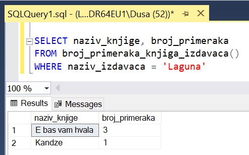 Исту функцију можемо да употребимо и у неком другом упиту. Можемо, на пример, да издвојимо књиге са бројем примерака који имамо у библиотеци само за једног издавача.