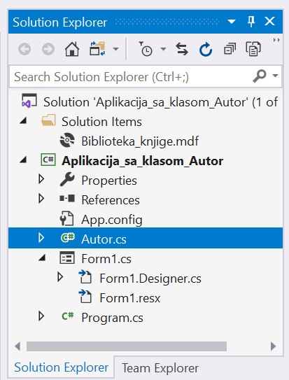 Пројекту треба да додамо базу података. У прозору Solution Explorer је потребно да се кликне десни тастер миша над називом пројекта, а затим да се изабере Add/Existing Item… са менија који се појави. База података коју смо креирали се већ налази на рачунару и потребно је пронаћи и изабрати фајл Biblioteka_knjige.mdf у којем је сачувана. Тачна локација може да се провери у систему SQL Server Management Studio у којем смо креирали базу.