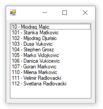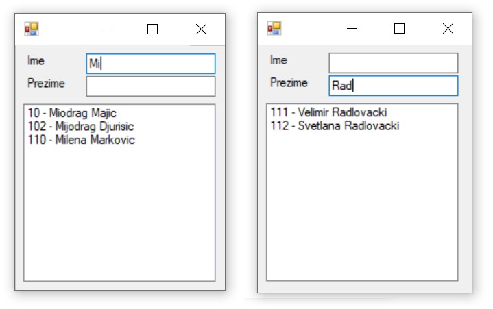 Програм можемо да зауставимо тако што затворимо прозор у којем је покренут и вратимо се у развојно окружење. Можемо да додамо два поља за унос текста тако да имамо могућност да претражујемо списак по имену или по презимену. Података нема много и цео садржај табеле можемо да учитамо у листу. Претрага листе је ефикаснија од поновног читања базе за свако име или презиме које нам треба.