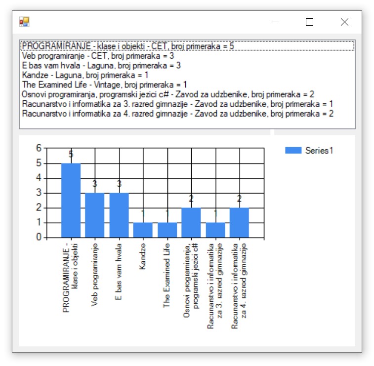 У апликацији ћемо приказати списак књига. Користићемо и објекат класе Chart да прикажемо графикон на којем се виде књиге и бројеви примерака.