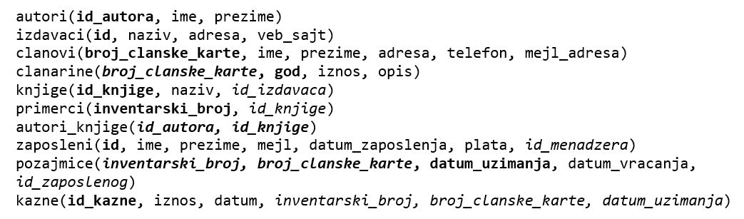 Сви приказани задаци су у вези са табелама које чине базу података за библиотеку. Следи списак свих табела са колонама. Примарни кључеви су истакнути болд, а страни италик.
