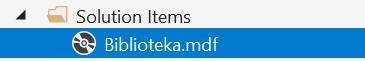 Када се креира нови пројекат, први корак је додавање раније креиране базе података. У прозору Solution Explorer је потребно да се кликне десни тастер миша над називом пројекта, а затим да се изабере Add/Existing Item… са менија који се појави. База података коју смо креирали се већ налази на рачунару и потребно је пронаћи и изабрати фајл Biblioteka.mdf у којем је сачувана. Тачна локација може да се провери у систему SQL Server Management Studio у којем смо креирали базу.
