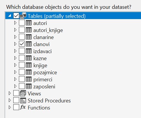 У последњем кораку је потребно изабрати жељену табелу са списка свих објеката који се налазе у бази података на коју смо се повезали.