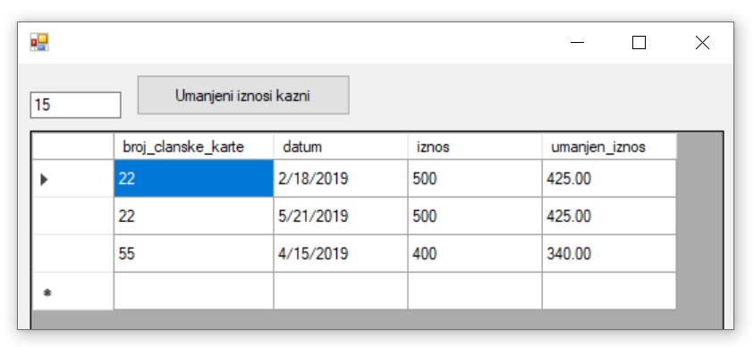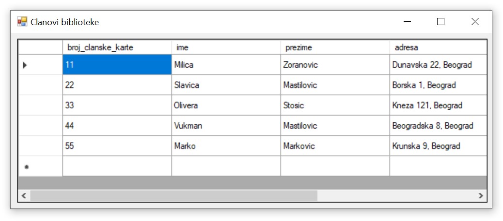 Приликом писања програма, потребно је да се употреби конекциони стринг, а односи се на повезивање програма на базу података Biblioteka.mdf. У решењима задатака стоји KONEKCIONI_STRING на местима где се очекује конекциони стринг.