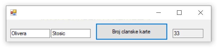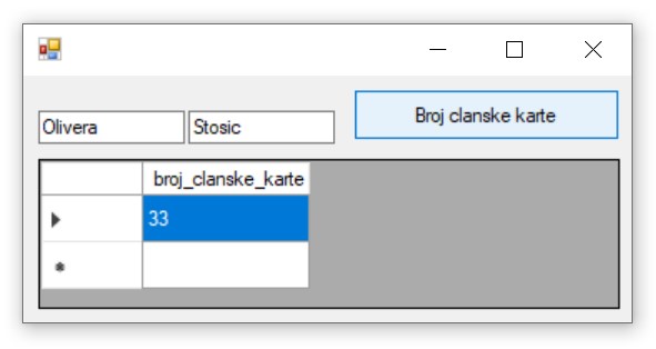 Други начин је да се позове функција коју смо креирали и која је сачувана у бази података. Да се подсетимо како изгледа скаларна функција која враћа број чланске карте. У овом случају изглед апликације може да се разликује. Није нам потребан DataGridView за приказ резултата.
