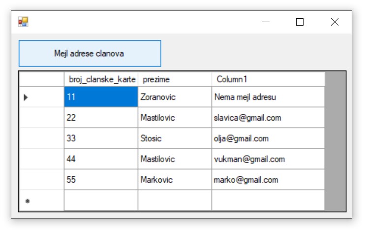 Задатак: Приказати податке о члановима: број чланске карте, презиме и мејл адреса. Уколико члан нема унету мејл адресу, приказати „Nema mejl adresu“.