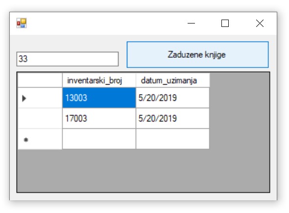 cmd = "SELECT inventarski_broj, datum_uzimanja " +