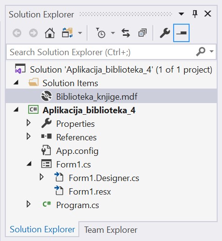 Први корак је додавање раније креиране базе података новом пројекту. У прозору Solution Explorer је потребно да се кликне десни тастер миша над називом пројекта, а затим да се изабере Add/Existing Item… са менија који се појави. База података коју смо креирали се већ налази на рачунару и потребно је пронаћи и изабрати фајл Biblioteka_knjige.mdf у којем је сачувана. Тачна локација може да се провери у систему SQL Server Management Studio у којем смо креирали базу.