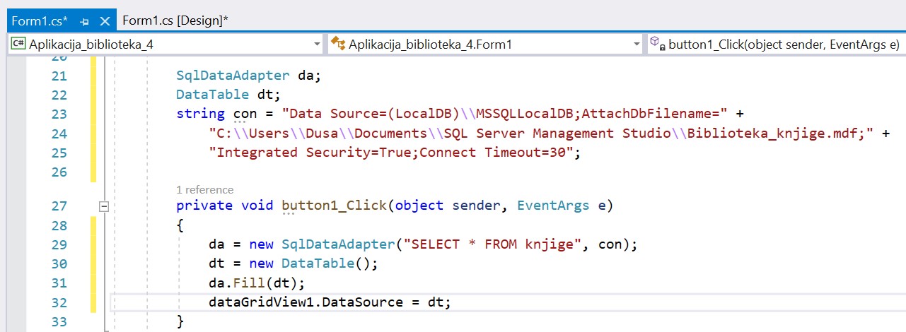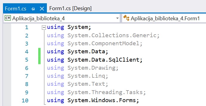 Класе које су нам потребне за читање података из базе и њихов приказ у програму се налазе у именском простору System.Data.SqlClient који није аутоматски укључен у нови пројекат. Потребно је да додамо следећи ред на врх документа са програмским кодом који добијамо када урадимо двоклик на дугме.