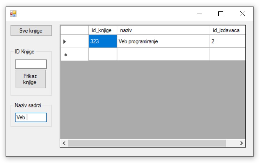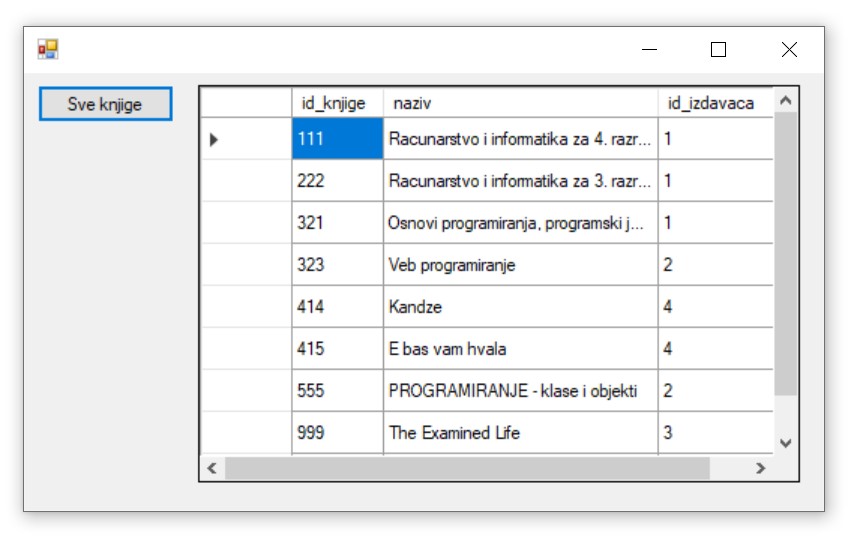 За повезивање са базом података нам је потребан објекат класе SqlDataAdapter. Приликом креирања тог објекта наводимо упит SELECT, у овом случају упит који приказује комплетан садржај табеле knjige, и конекциони стринг. Креирани објекат ћемо употребити да попунимо објекат класе DataTable који директно можемо да упишемо у постављени DataGridView. Имамо могућност да на различите начине именујемо објекте које креирамо, а у свим примерима који следе ћемо се придржавати правила именовања да је назив објекта скраћеница назива класе на енглеском језику.
