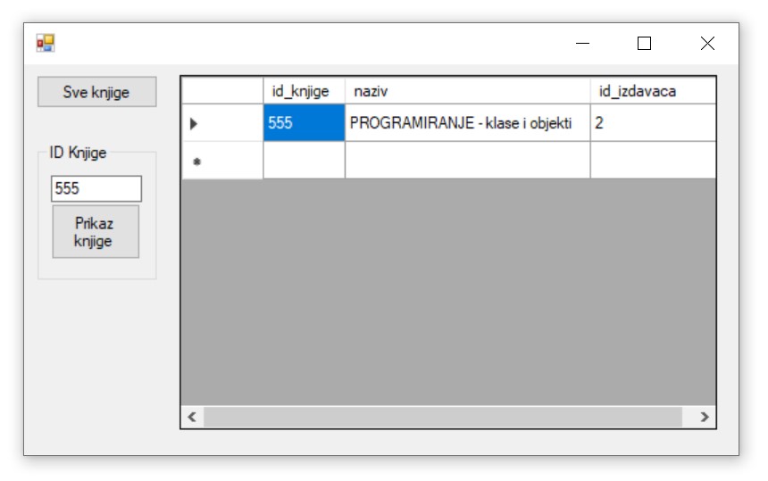 Следи програмски код којим издвајамо жељену књигу. Текст упита смо формирали тако што смо на део упита који је исти за сваку књигу налепили број који смо прочитали из поља за унос текста.