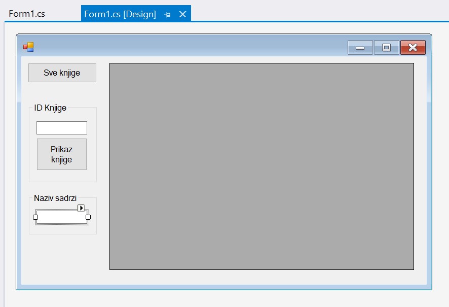 Наставићемо рад на нашем програму. Потребно је да се вратимо на картицу Form1.cs [Design] и да дорадимо дизајн за следећи део програма. Из помоћног прозора Toolbox превучемо један GroupBox и у њега ставимо један TextBox за унос идентификационог броја и дугме за приказ података о књизи са тим бројем.