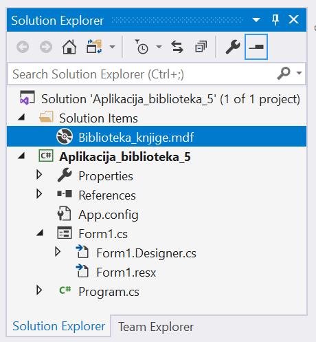 Први корак је додавање раније креиране базе података новом пројекту. У прозору Solution Explorer је потребно да се кликне десни тастер миша над називом пројекта, а затим да се изабере Add/Existing Item… са менија који се појави. База података коју смо креирали се већ налази на рачунару и потребно је пронаћи и изабрати фајл Biblioteka_knjige.mdf у којем је сачувана. Тачна локација може да се провери у систему SQL Server Management Studio у којем смо креирали базу.