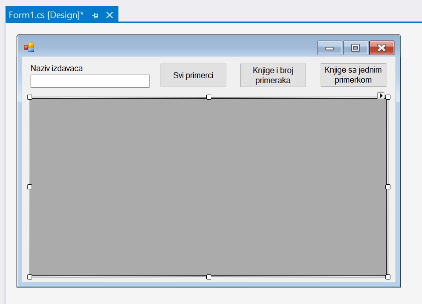 Потребно је да додамо и поље за унос назива издавача, тј. један TextBox, као и три дугмета за различите опције. У прозору Properties изменимо својство Text за свако дугме тако да на дугмету пише текст који одговара радњи која ће да се догоди када се на дугме кликне. Комплетан дизајн апликације се види на следећој слици.