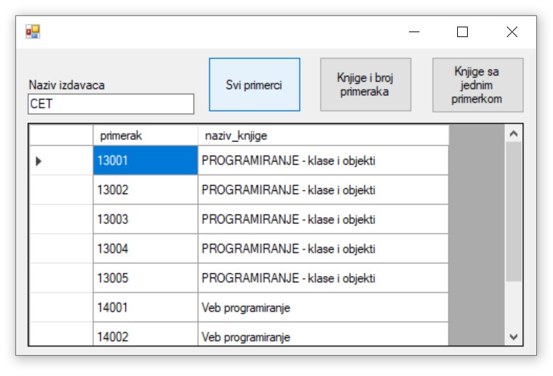 Следи комплетан програмски код којим се приказује тражени списак свих примерака књига једног издавача. Уместо KONEKCIONI_STRING треба ставити конекциони стринг који је формиран у ранијим примерима, а односи се на повезивање програма на базу података Biblioteka_knjige.mdf.