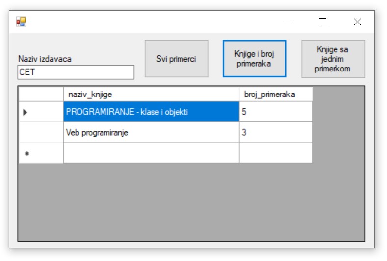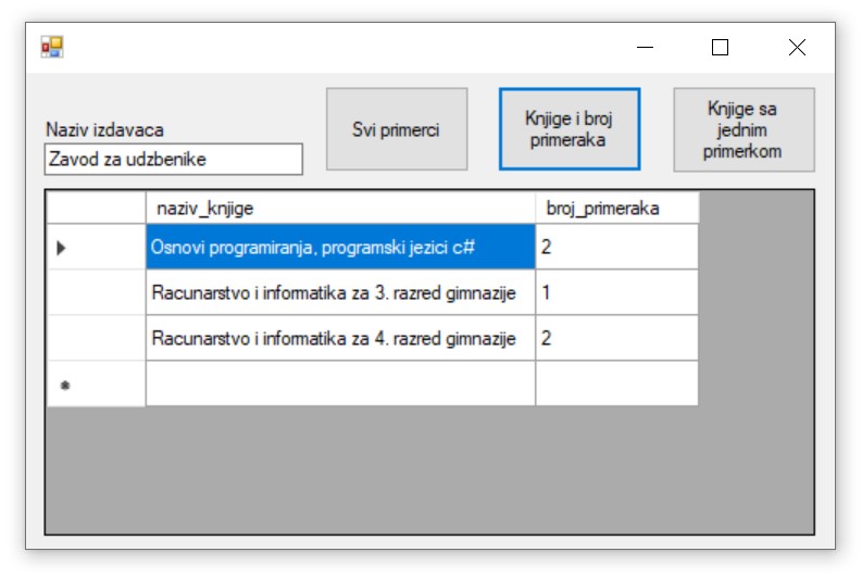 Има смисла да додамо и извештај који приказује за сваку књигу број примерака. Програм можемо да зауставимо тако што затворимо прозор у којем је покренут и вратимо се у развојно окружење.