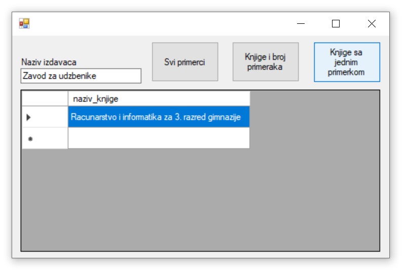 Програм можемо да зауставимо тако што затворимо прозор у којем је покренут и вратимо се у развојно окружење. Додаћемо и програмски код којим се издвајају оне књиге од којих имамо само један примерак у библиотеци.