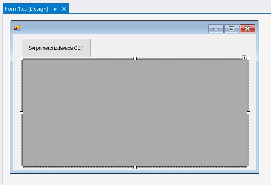 За приказ резултата рада процедуре коja узима податке из релационе базе података је најбоље да се користи контрола DataGridView, коју можемо да превучемо из прозора Toolbox. Потребно је да додамо и дугме. У прозору Properties изменимо својство Text за дугме тако да на дугмету пише текст који одговара радњи која ће се догодити када се на дугме кликне. Комплетан дизајн апликације се види на следећој слици.