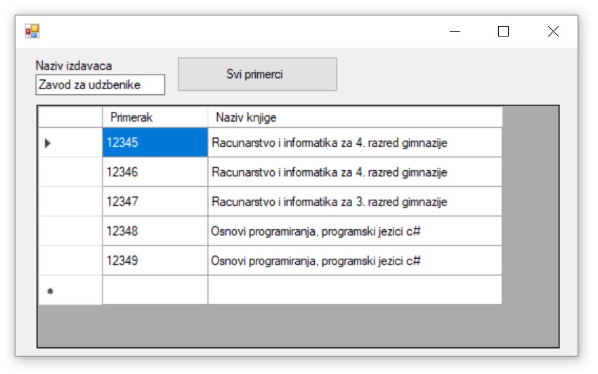 Следи комплетан програмски код којим се приказује тражени списак свих примерака књига једног издавача. Уместо KONEKCIONI_STRING треба ставити конекциони стринг који је формиран у ранијим примерима, а односи се на повезивање програма на базу података Biblioteka_knjige.mdf.